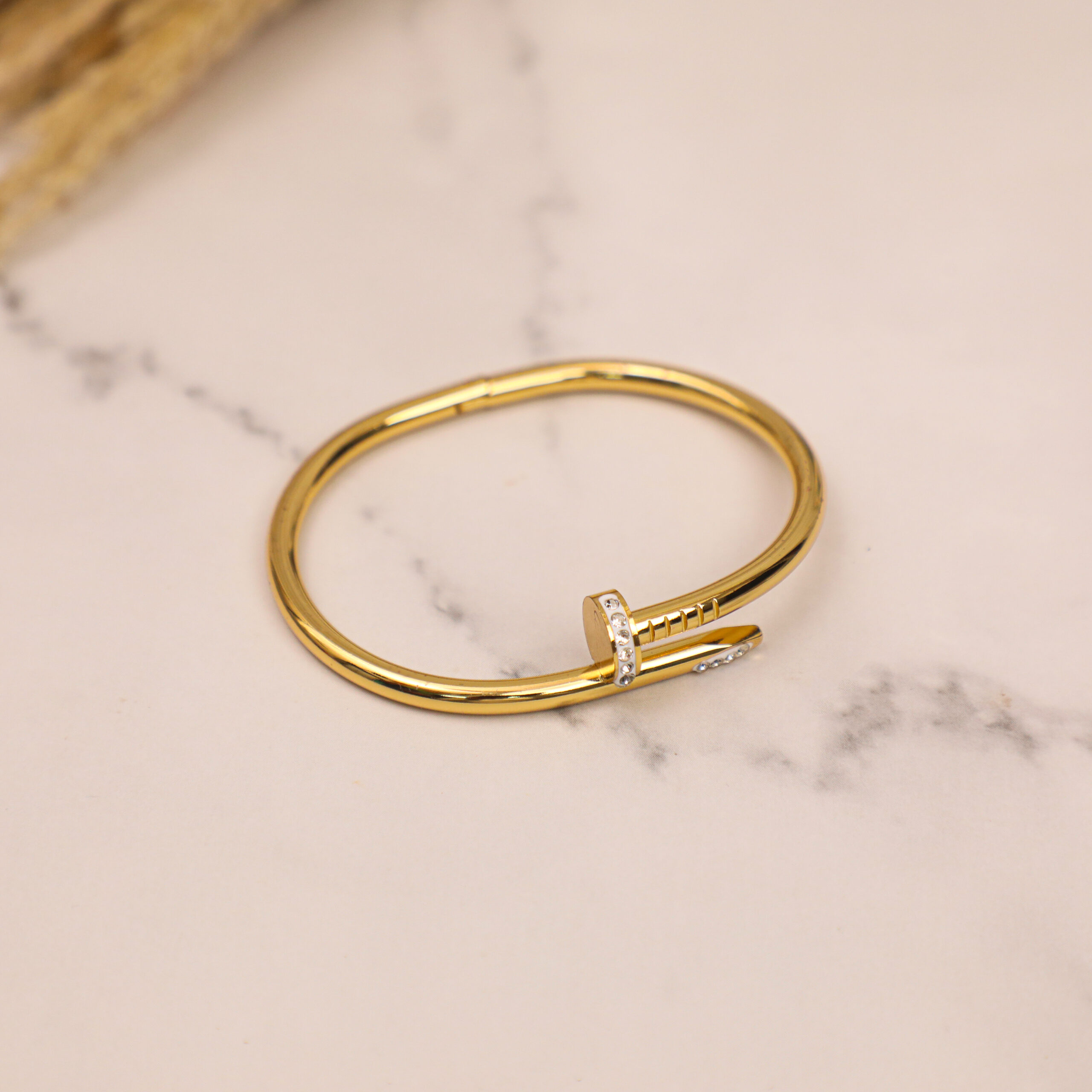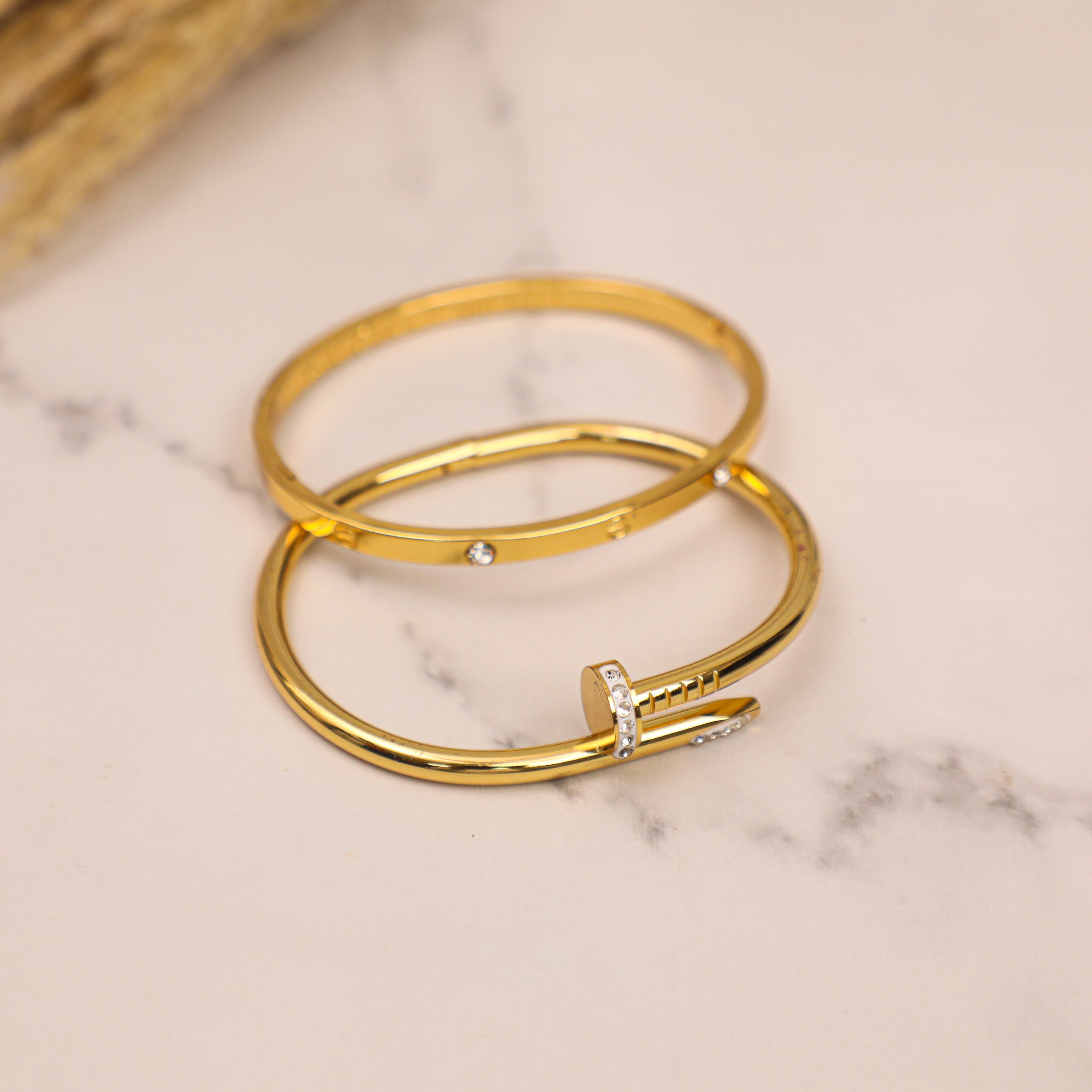 Elevate your style with the Bauble Cluster Stainless Steel Anti-Tarnish Bracelet Stack, featuring a bold statement nail bracelet and a timeless love band cuff. Crafted from premium stainless steel with a radiant gold finish, these bracelets are durable, anti-tarnish, and perfect for everyday wear. Wear them individually for a minimal look or stack them for a striking statement. Designed with an adjustable fit, this elegant combo effortlessly complements both casual and formal outfits, making it a must-have addition to your jewelry collection.