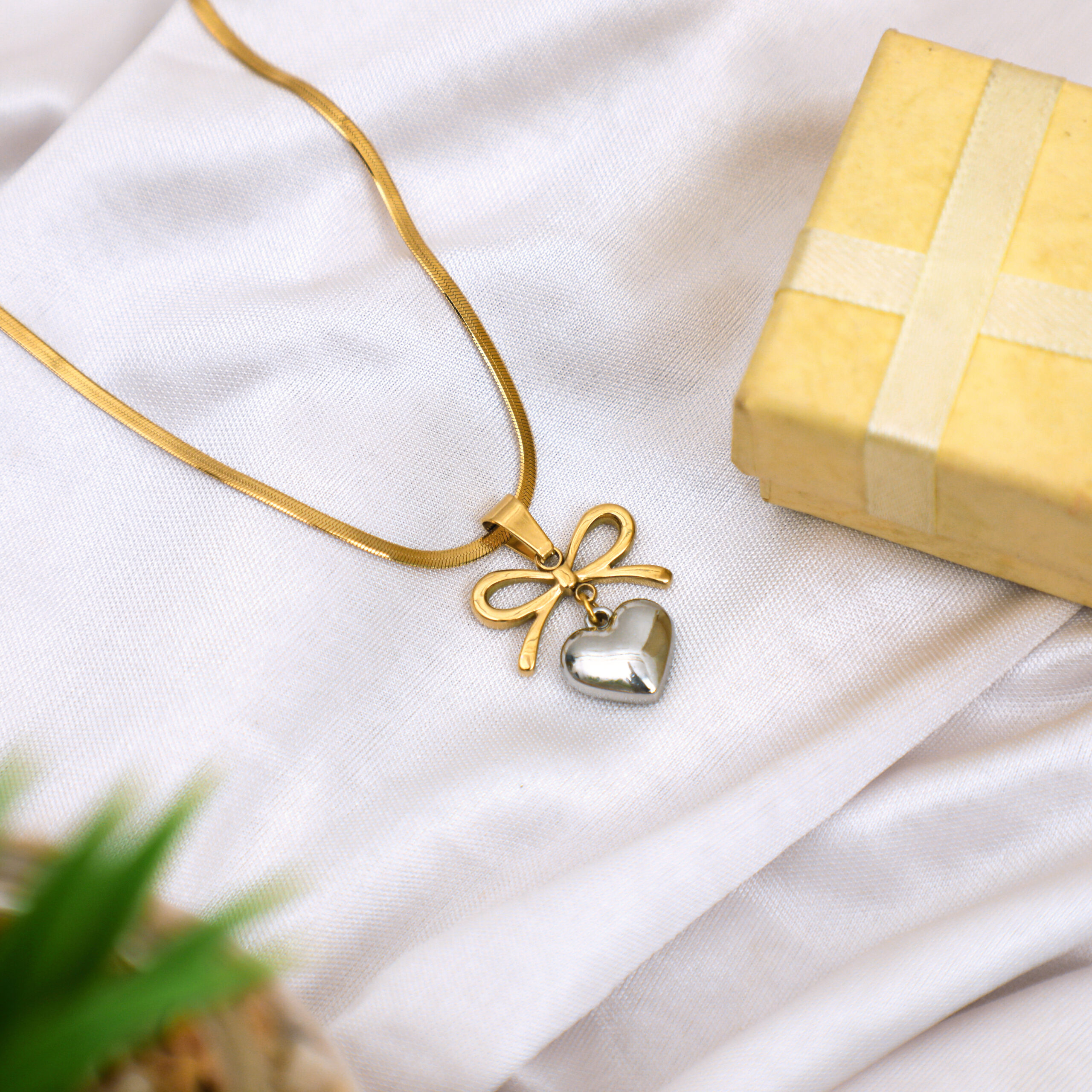 • ELEGANT DESIGN: Beautiful gold-plated necklace featuring a delicate bow charm with a hanging heart pendant, perfect for everyday wear and special occasions