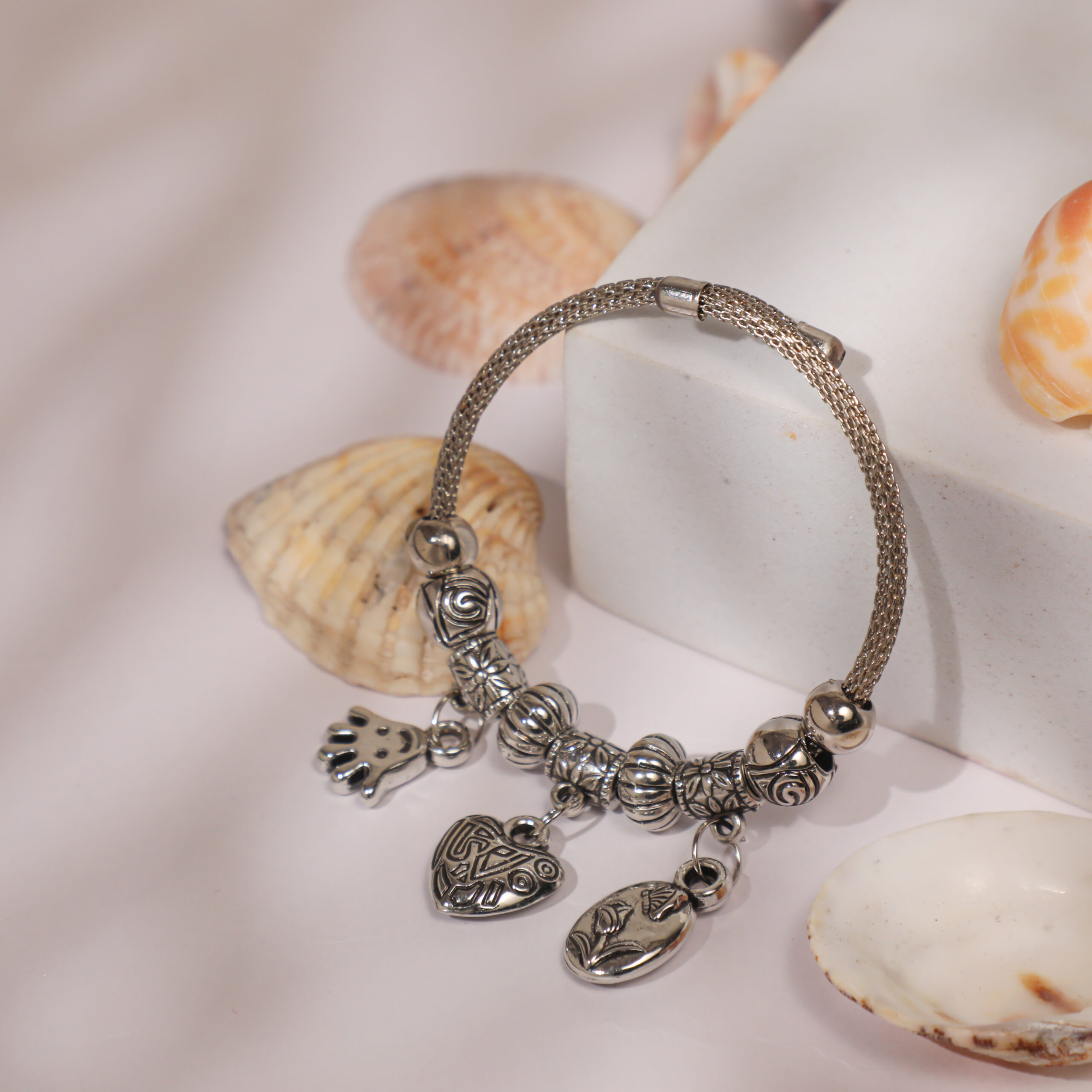 • ✅ Elegant Silver Charm Design – Features a stylish silver-toned bangle adorned with charming pendants like hearts, keys, stars, butterflies, flowers, trees, crowns, and locks.