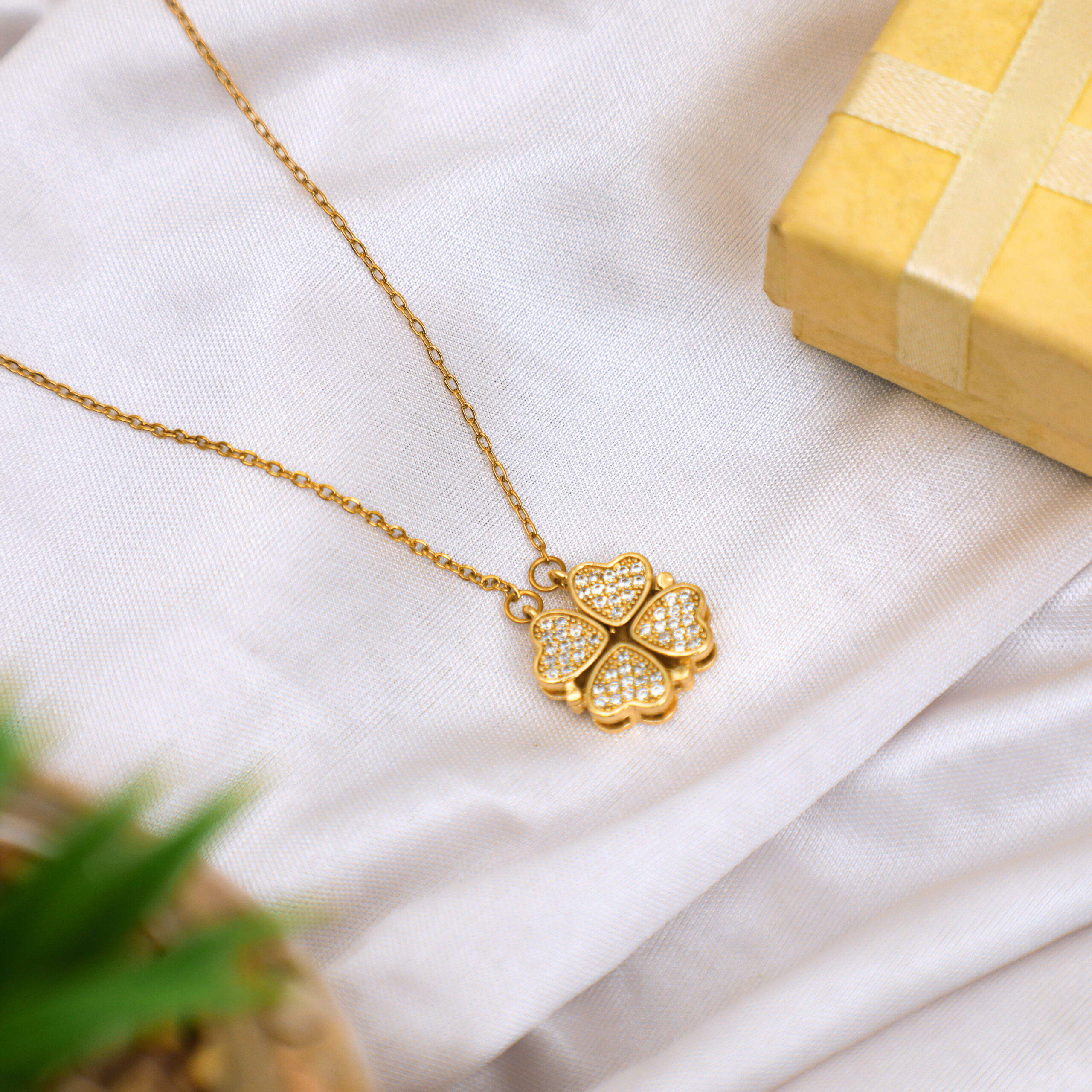 - Design: Four-leaf clover pendant with magnetic closure